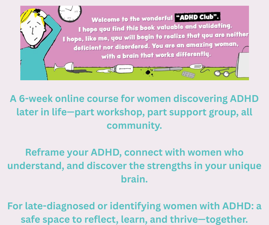 This six-week online course is based on Laura’s new book and is designed for women who were late-diagnosed or who are just beginning to recognize their ADHD. Blending workshop, support group, and community, it offers a safe, collaborative space to explore your lived experiences, share challenges, and discover strengths.